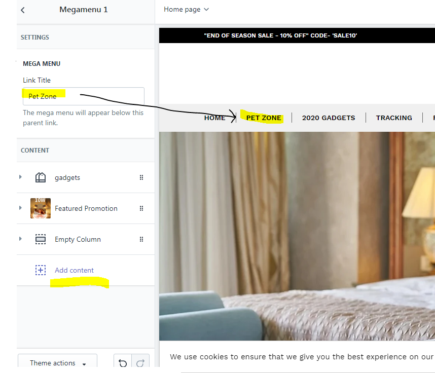1. From Shopify admin > Online store >Themes> Theme settings> Logos and Mega Menu.
